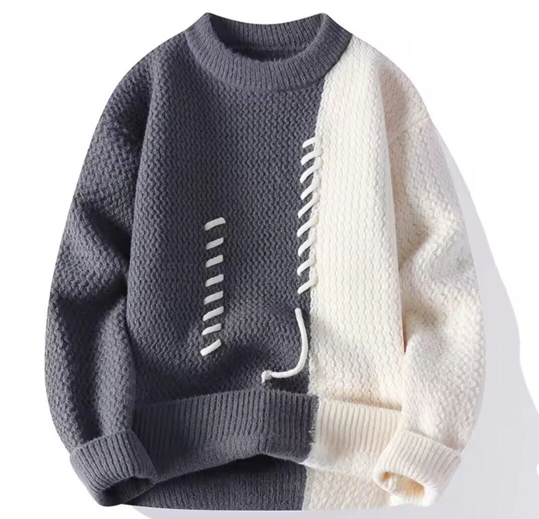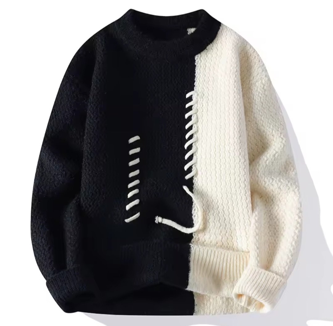 This sweater is a modern, eye-catching piece that blends cozy comfort with a deconstructed, “DIY” aesthetic. Its high-contrast color palette and unique stitching make it a versatile addition to a streetwear or casual wardrobe.