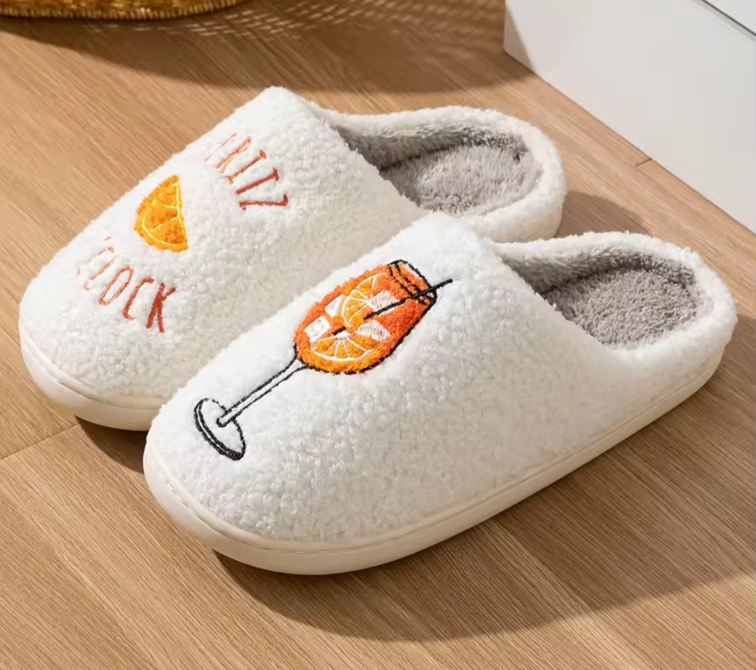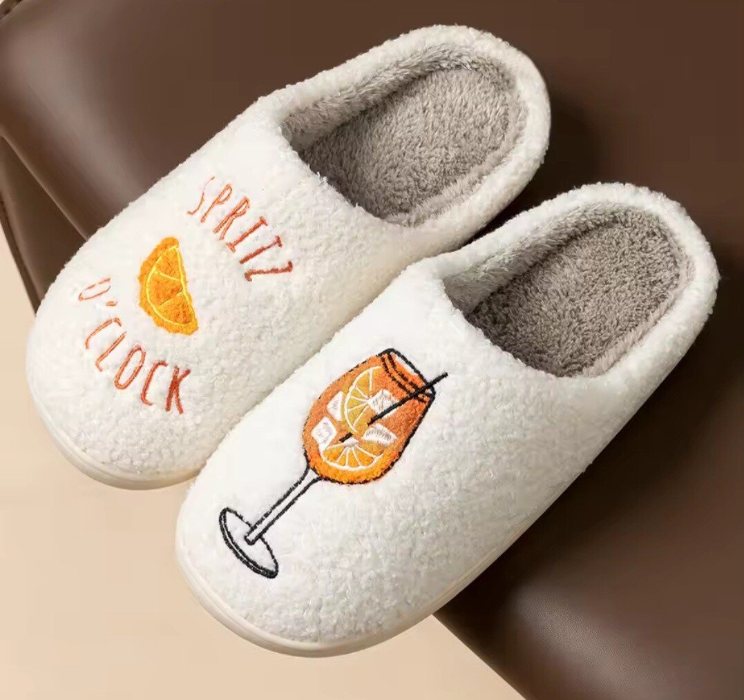 Experience ultimate relaxation with these playful and cozy plush slippers, perfect for unwinding after a long day. Featuring a charming “Spritz O’Clock” theme, these slippers combine a whimsical design with high-quality materials to keep your feet warm and stylish.
